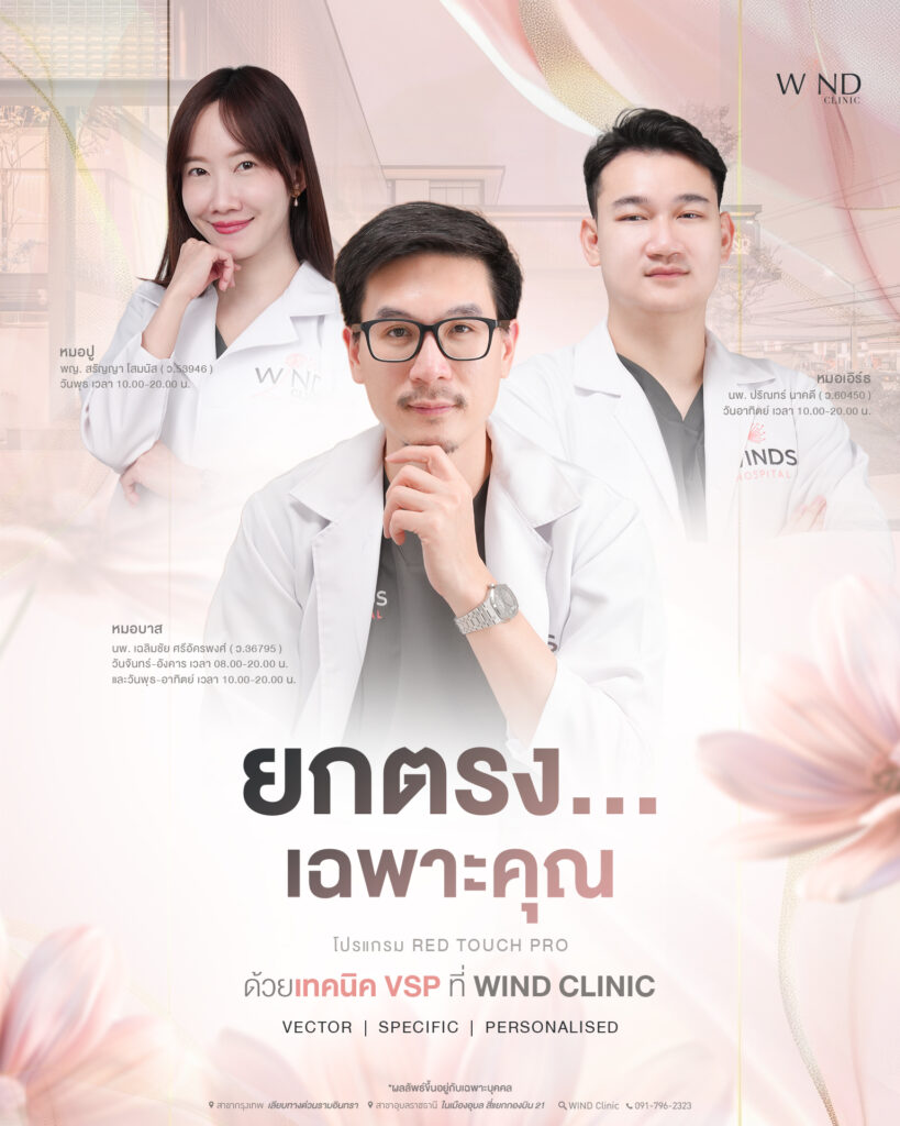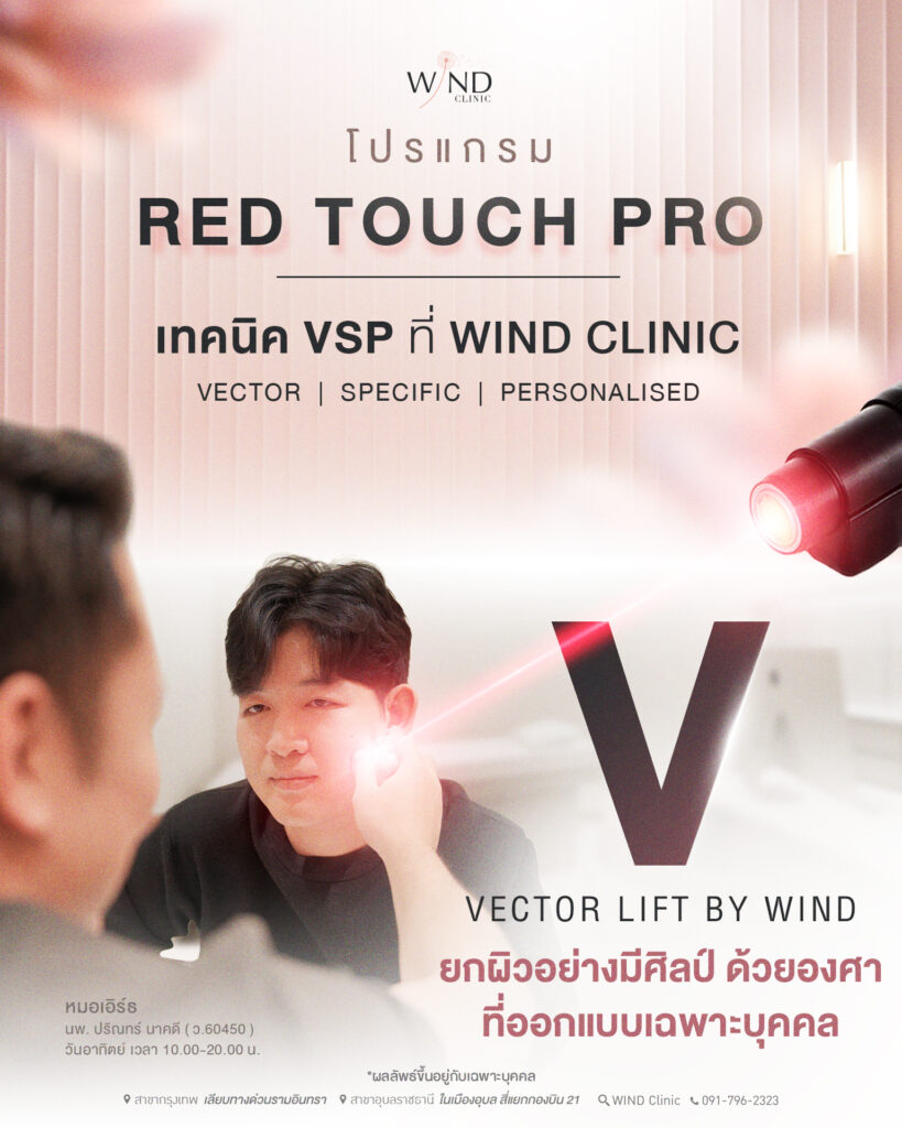 ความชำนาญการและเทคนิค VSP: Vector | Specific | Personalised คือสิ่งที่ทำให้โปรแกรม Red Touch Pro ที่ WIND Clinic แตกต่างและนำมาซึ่งผลลัพธ์ที่น่าประทับใจ เราไม่ได้เพียงแต่ “รักษา” แต่เรา “ออกแบบ” ความงามที่เหมาะสมและยั่งยืนให้กับคุณ เพราะเราเข้าใจดีว่า โครงหน้าและปัญหาผิวของแต่ละคนไม่เหมือนกัน การดูแลรักษาจึงต้อง “แตกต่าง”
