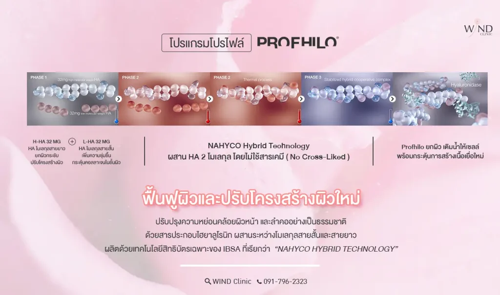 Profhilo เป็นนวัตกรรม Bio-Remodeling ที่ใช้กรดไฮยาลูรอนิกบริสุทธิ์ 100% ผลิตด้วยเทคโนโลยี NAHYCO® จากสวิตเซอร์แลนด์ โดดเด่นด้วยความเข้มข้นสูง (64 mg/2ml) และใช้เทคนิคพิเศษในการรวมกรดไฮยาลูรอนิกสองขนาด ทำให้กระจายตัวใต้ผิวได้ดี กระตุ้นการสร้างคอลลาเจนและอีลาสติน ช่วยให้ผิวชุ่มชื้น กระชับ ลดเลือนริ้วรอย โดยผลลัพธ์อยู่ได้นาน 6-8 เดือน