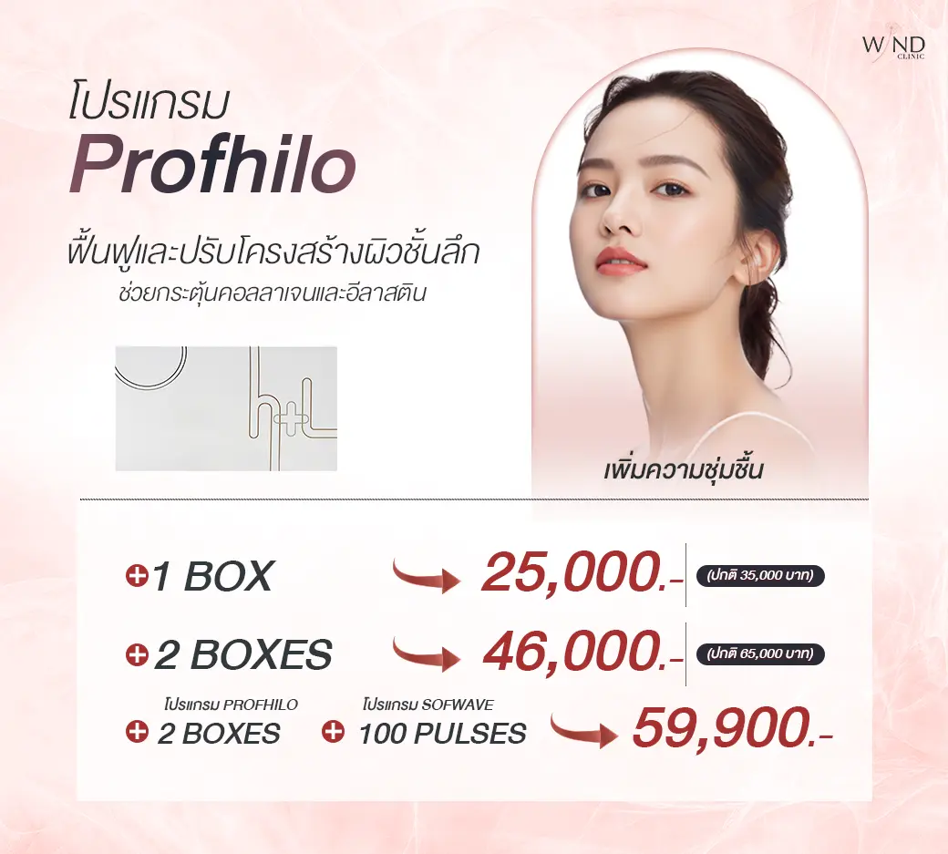 Profhilo เป็นนวัตกรรมใหม่ในการฟื้นฟูผิวหน้าและลำคอ ด้วยส่วนผสมของกรดไฮยาลูรอนิกเข้มข้นสูงถึง 53 มิลลิกรัมต่อมิลลิลิตร Profhilo ช่วยกระตุ้นการผลิตคอลลาเจนและอีลาสติน ทำให้ผิวของคุณดูอ่อนเยาว์และเรียบเนียนขึ้น